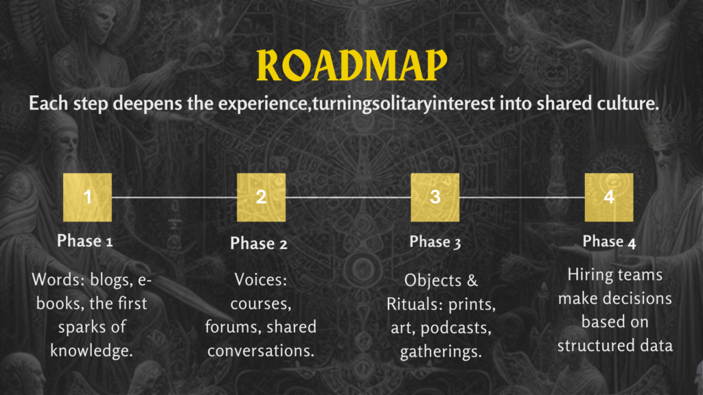 Words first: essays, newsletter, the content that earns the audience before asking anything of them. Then voices: the community that coalesces around the writing. Then objects and rituals: physical things made for practice, not decoration. Then data: original research that can only emerge from a community at scale, doing actual work.